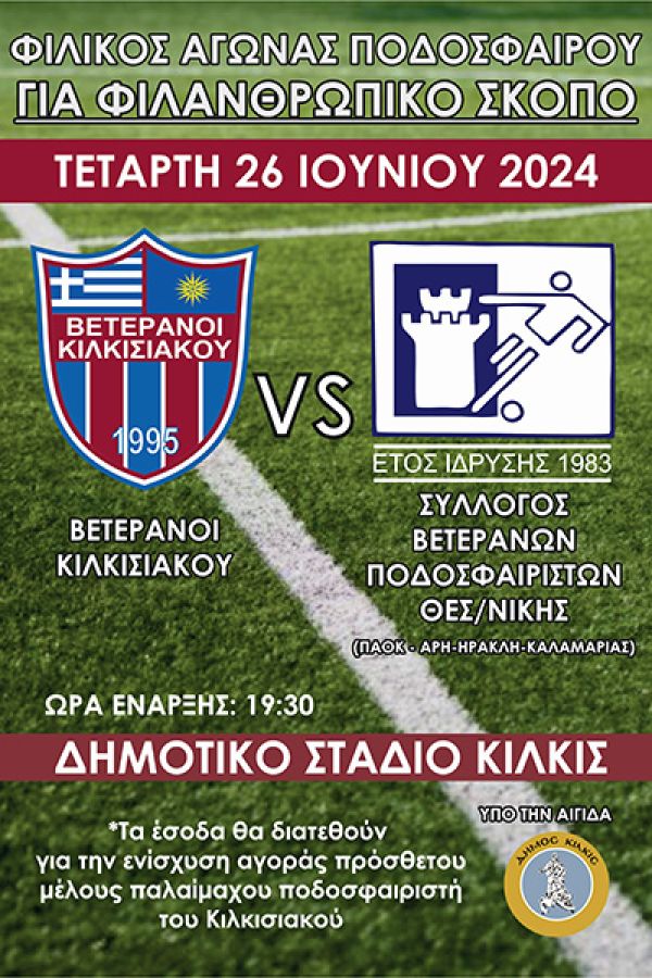 Βετεράνοι Κιλκισιακού – Σύλλογος Βετεράνων ποδοσφαιριστών Θεσσαλονίκης: Φιλικός αγώνας ποσδοσφαίρου για φιλανθρωπικό σκοπό