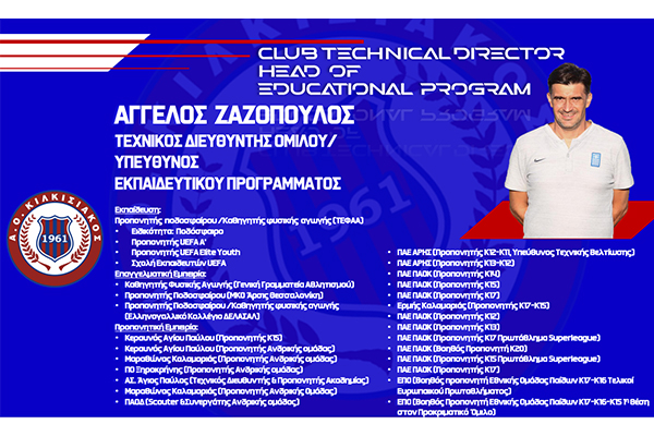"Ο Α.Ο. Κιλκισιακός, ανακοινώνει την έναρξη της συνεργασίας του με τον κ. Άγγελο Ζαζόπουλο στη θέση του Τεχνικού Διευθυντή του Ομίλου και Υπεύθυνου Εκπαιδευτικού Προγράμματος!
