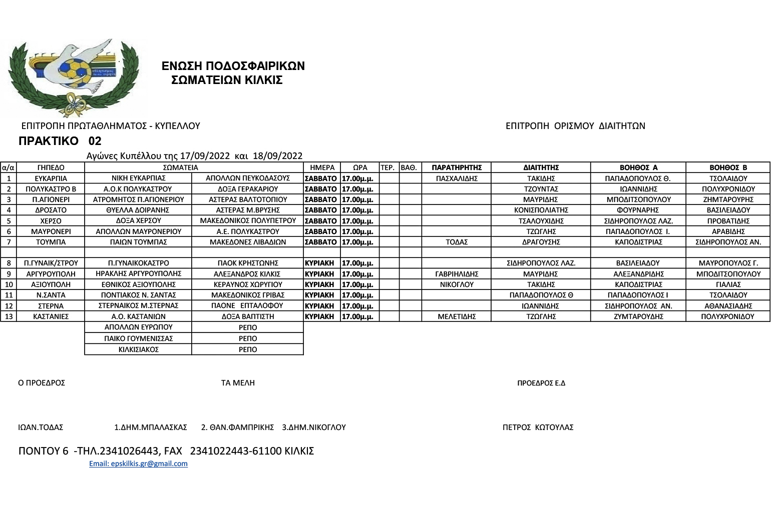 Δείτε στον πίνακα τους αγώνες που θα γίνουν και τους διαιτητές και τους παρατηρητές που έχουν ορισθεί από την Επιτροπή της ΕΠΣΚ.