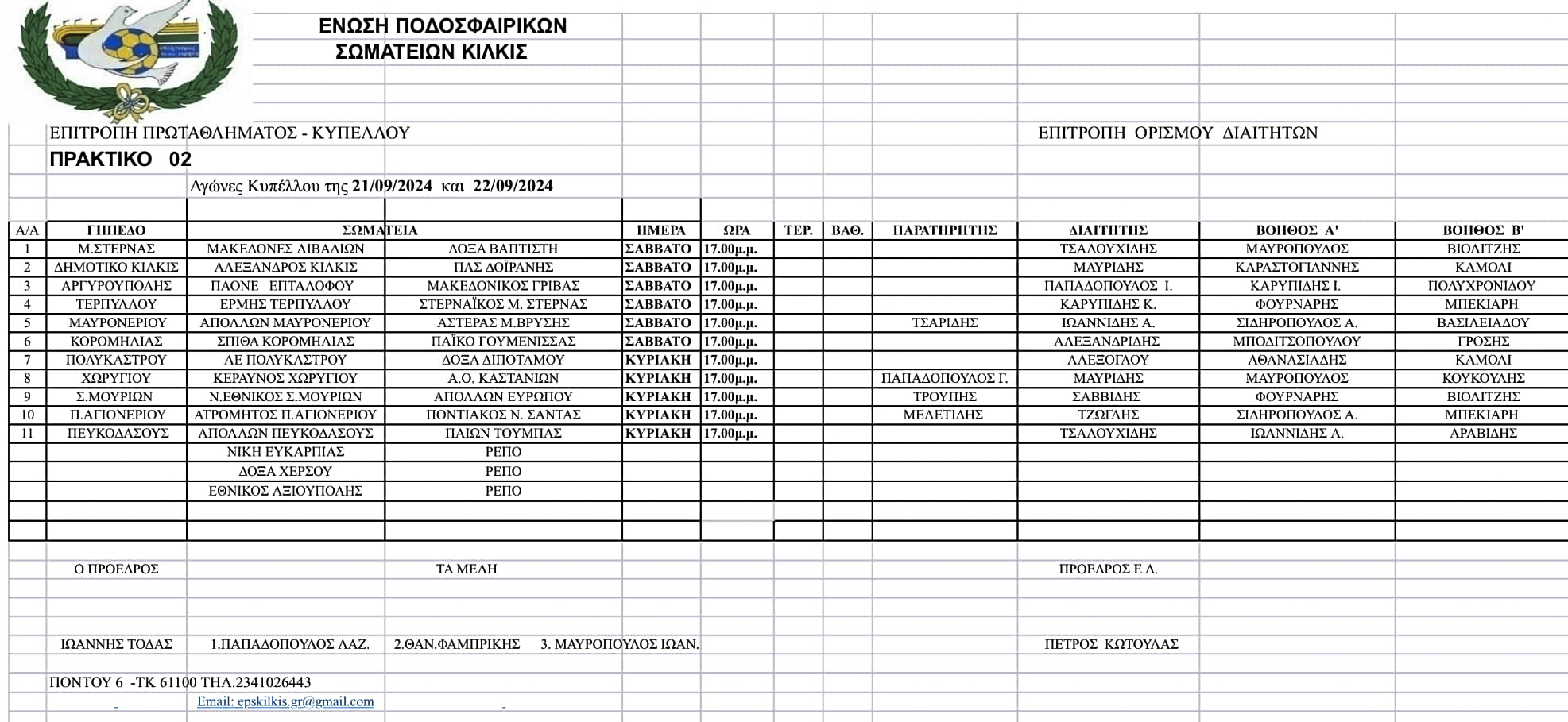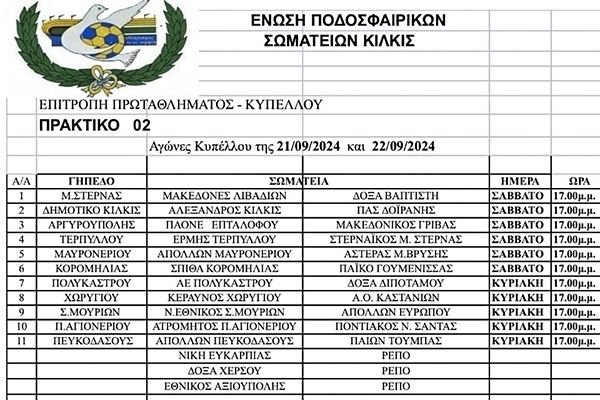 Οι αγώνες κυπέλλου της ΕΠΣ Κιλκίς στις 21 και 22/9/2024, οι παρατηρητές και οι διαιτητές που θα διευθύνουν